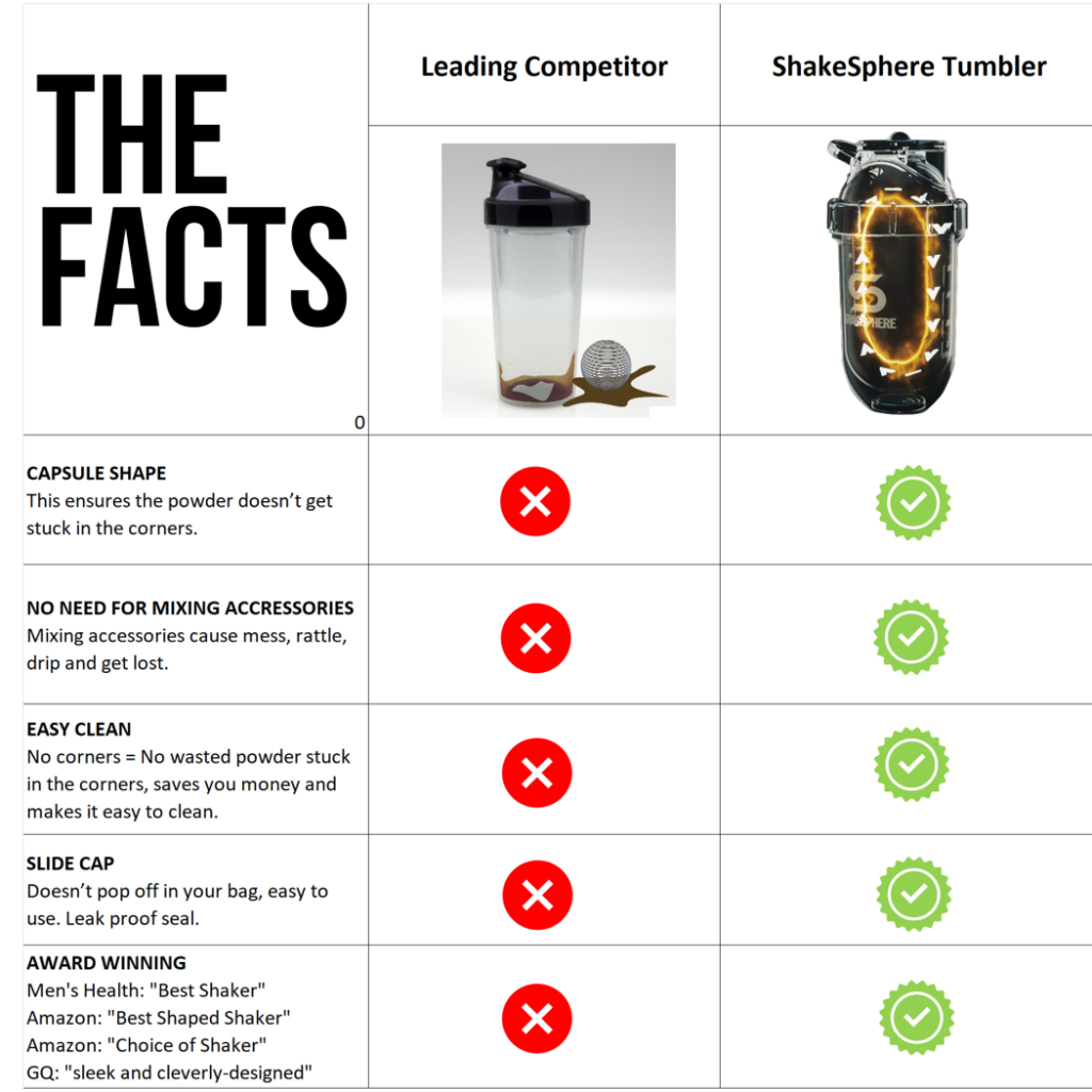 You may think having no mixing accessories means a lot of wasted shake. You’d be wrong. Because there are no corners, nothing gets left in the bottle when you’ve finished with it. This not only means you spend less time cleaning it, but also saves you money as you need less powder in the long-run. No waste also prevents the build-up of the foul smells which develop when undissolved powder lingers in the corners of your typical shaker bottle. It’s no wonder we were voted Best Protein Shaker 2019 by Men’s Health and have already received 9 awards this year recognising our Tumbler as the best shaker on the market right now.