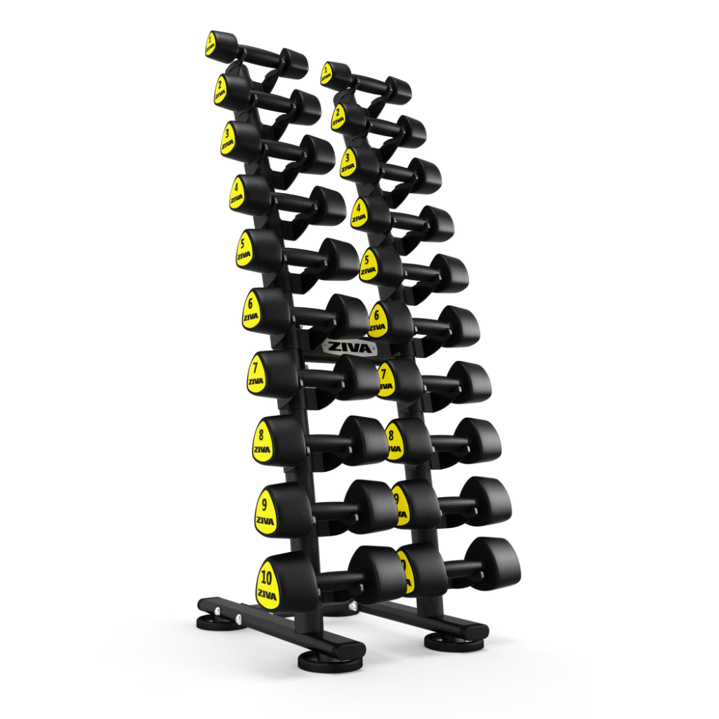 Designed with useful features, the Ziva ST2 1-10kg Studio Dumbbell Rack with PU Saddle is solidly constructed, coupled with very handy design. The rubber cushioned saddles help hold the dumbbells in place and the baked coating is for long lasting durability. Other key features include steel wire saddles and non-marking feet.